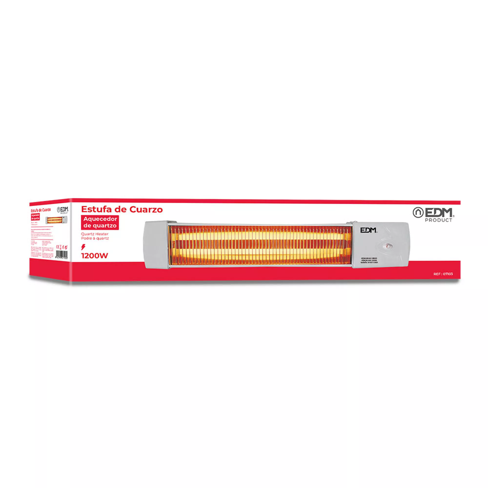 ESTUFA DE BAÑO ORIENTABLE CON 2 BARRAS DE CUARZO Y REFLECTOR PULIDO. CON KIT DE MONTAJE PARA PARED, INTERRUPTOR Y SELECTOR DE POTENCIAS POR TIRADOR. TIENE 2 NIVELES DE POTENCIA: 600 Y 1200 W. 220-240 V / 50 Hz. RECAMBIO DE TUBO: REF. 07904. DIMENSIONES: 57 x 10 x 10,5 cm