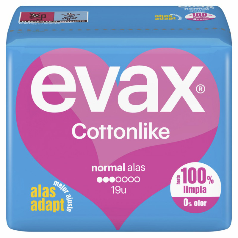 COMPRESA EVAX  NORMAL ALAS.19 UNIDADES.Perlas activas.Tecnologia mejorada .Ahora eliminan el olor durante más tiempo.Tacto algodón.